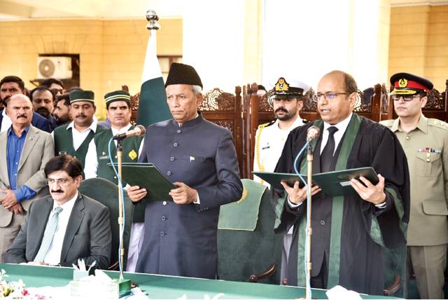 KARACHI  –  A Pakistan Muslim League N senior leader, Senator Syed Muhammad Nehal Hashmi, Friday, sworn in as the 35th Governor of Sindh following his appointment under Articles 48 and 101 of the Constitution of the Islamic Republic of Pakistan. The Chief Justice Sindh High Court Zafar Ahmed Rajput administered the oath of office of Governor Sindh to Senator Nehal Hashmi in a simple and dignified oath-taking ceremony held at the Sindh Governor House.